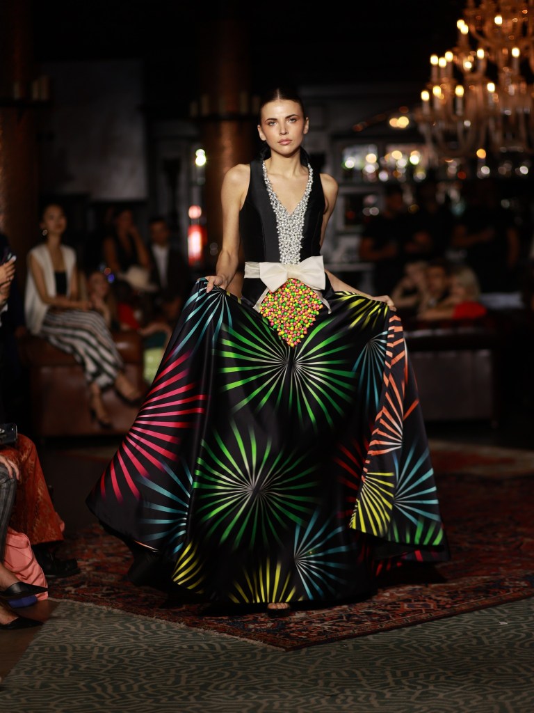 He told me his unique pieces are designed in London and Italy. The collection was inspired by Mexico. We have a western vision in a saloon, we mix florescent colours