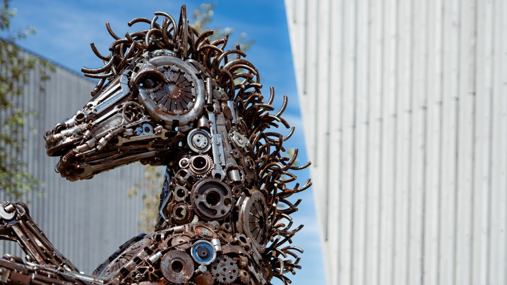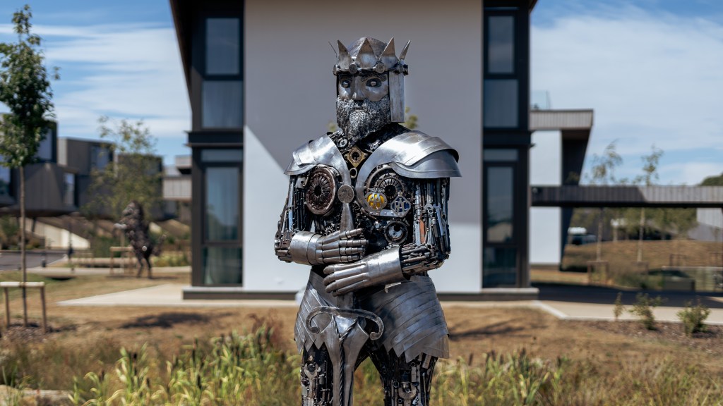 Sarah Mae Francis’ Enzo (£11,050) is a dynamic horse formed from car parts and sheet metal, complemented by The Knight (£14,625) (aka Mr Silver Stone), a powerful figure.