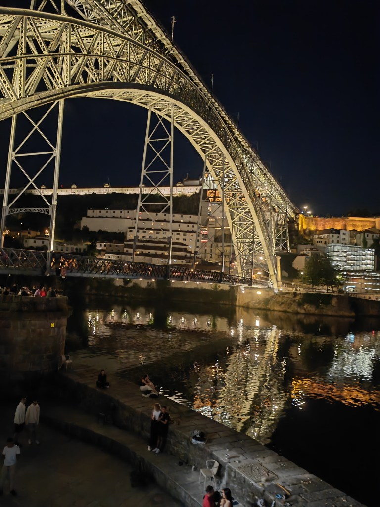Below the bridge, the Ribeira waterfront hums with life. Cafés spill onto cobbled streets, and terraces brim with locals and travelers sharing glasses of vinho verde, petiscos (Portuguese tapas), and laughter that echoes off the river. As the sun dips, lights flicker on in the bustling bars and taverns, casting warm reflections onto the water and blending with the golden glow of the setting sun. It’s a scene of perpetual motion, musicians playing on street corners, couples strolling along the promenade, and friends gathering for evening drinks — that captures Porto’s charm and vitality.