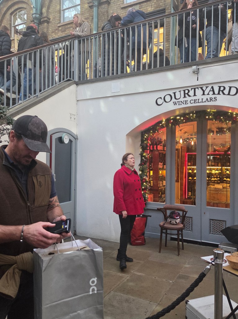 Covent Garden in December is magical: the marketplace glows with lights, street performers bring cheer, and the aroma of roasted chestnuts fills the air. Yet, beneath it all, Courtyard Wine Cellars offers a quiet, atmospheric retreat. The historic cellar, welcoming ambiance, and seasonal décor make it the perfect counterpoint to the lively streets above – a secret festive hideaway in the heart of London, where you can blissfully drift away for the afternoon. When you step outside you are treated to live operatic performances. Browse the charming stores in the wonderfully festive Covent Garden stores from Charlotte Tilbury to the new Chanel Pop up.