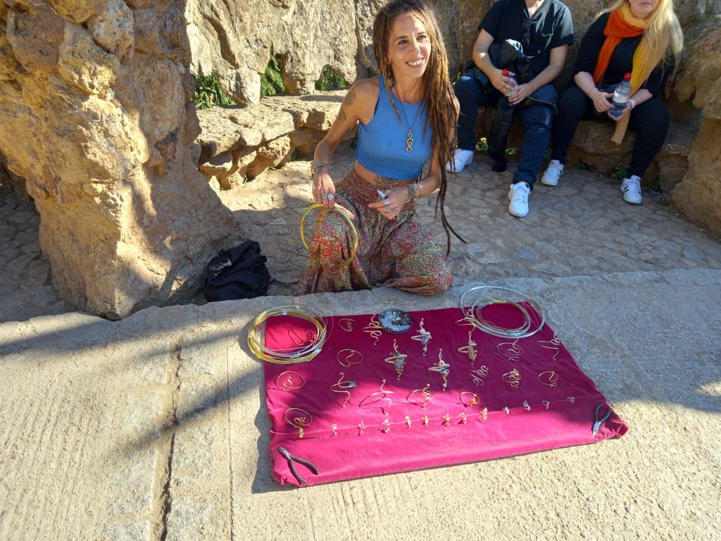 Towering stone columns rise from the ground like trees, supporting shaded walkways that feel both natural and fantastical. Playful sculptures, dragons, salamanders, and abstract shapes, peek out from alcoves, while intricate gingerbread-like pavilions with tiled roofs create a fairy-tale atmosphere. As you ascend to the terrace, the iconic mosaic lizard watches over the park, and you pause to take in the sweeping views of Barcelona’s rooftops and the distant sea. The air is filled with the gentle chatter of visitors, the occasional strum of a guitar, and the rustle of leaves, creating a sense of joyful discovery at every turn.