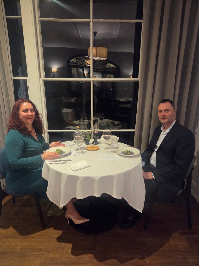 Then we enjoyed an appetiser of sourdough bread served with Ampersand butter, washed down with a glass of Pierre Mignon champagne. Next, we enjoyed salt-baked beetroot with goat’s curd and pumpkin seeds, washed down with Sauvignon Blanc. This was followed by a grilled Cornish Mackerel with avocado and lime dukkah, accompanied by an Albarino. This satiated us before the main course of honey-glazed duck breast, accompanied by a Carignan and Chicory, Gnocchi and Celeriac.