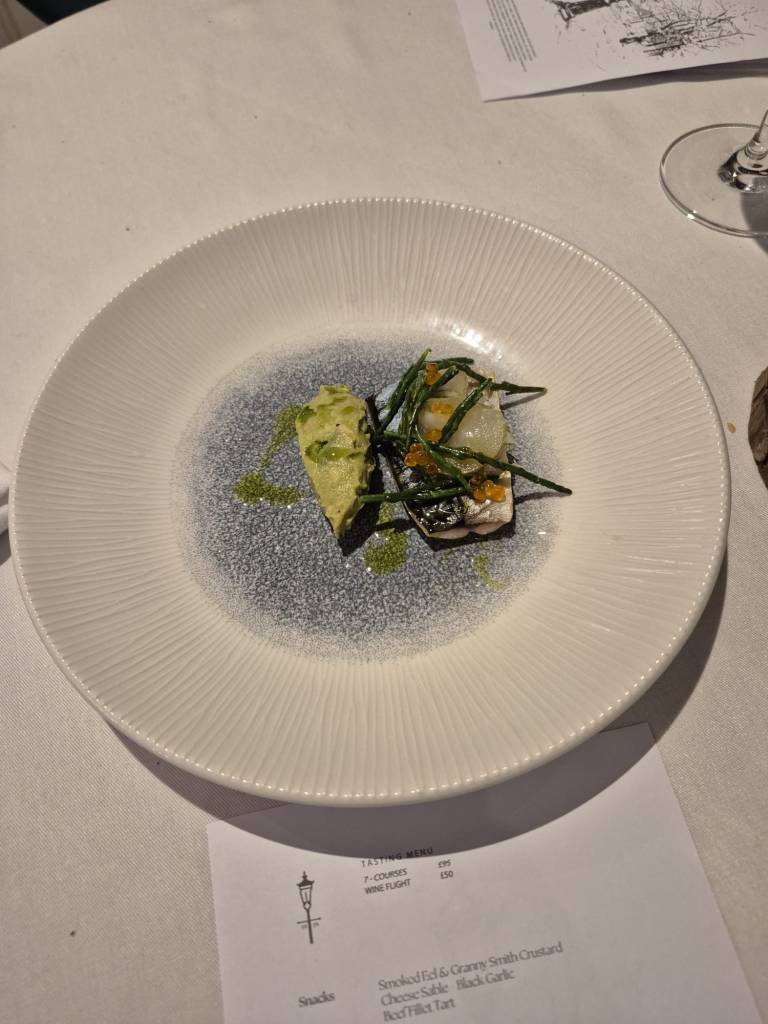 A seven-course tasting menu awaited, accompanied by a wine flight – the banquet costs £95, and the wine flight is an additional £50 per person. We started with snacks of smoked eel wrapped in caviar and Granny Smith custard, cheese sable, black fillet, and a beef-filled tart, all exquisitely prepared.