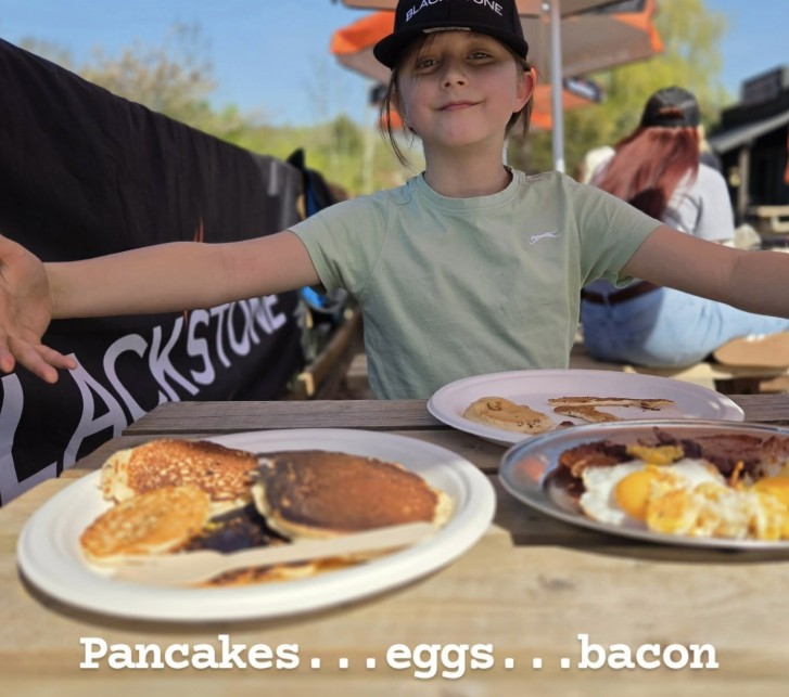 One of the most memorable parts of the day was cooking on the flat-top griddle. We started by frying breakfast bacon and eggs fresh from the yard hens before moving on to pancakes, which my daughter absolutely loved making. It was delicious – a breakfast of champions.